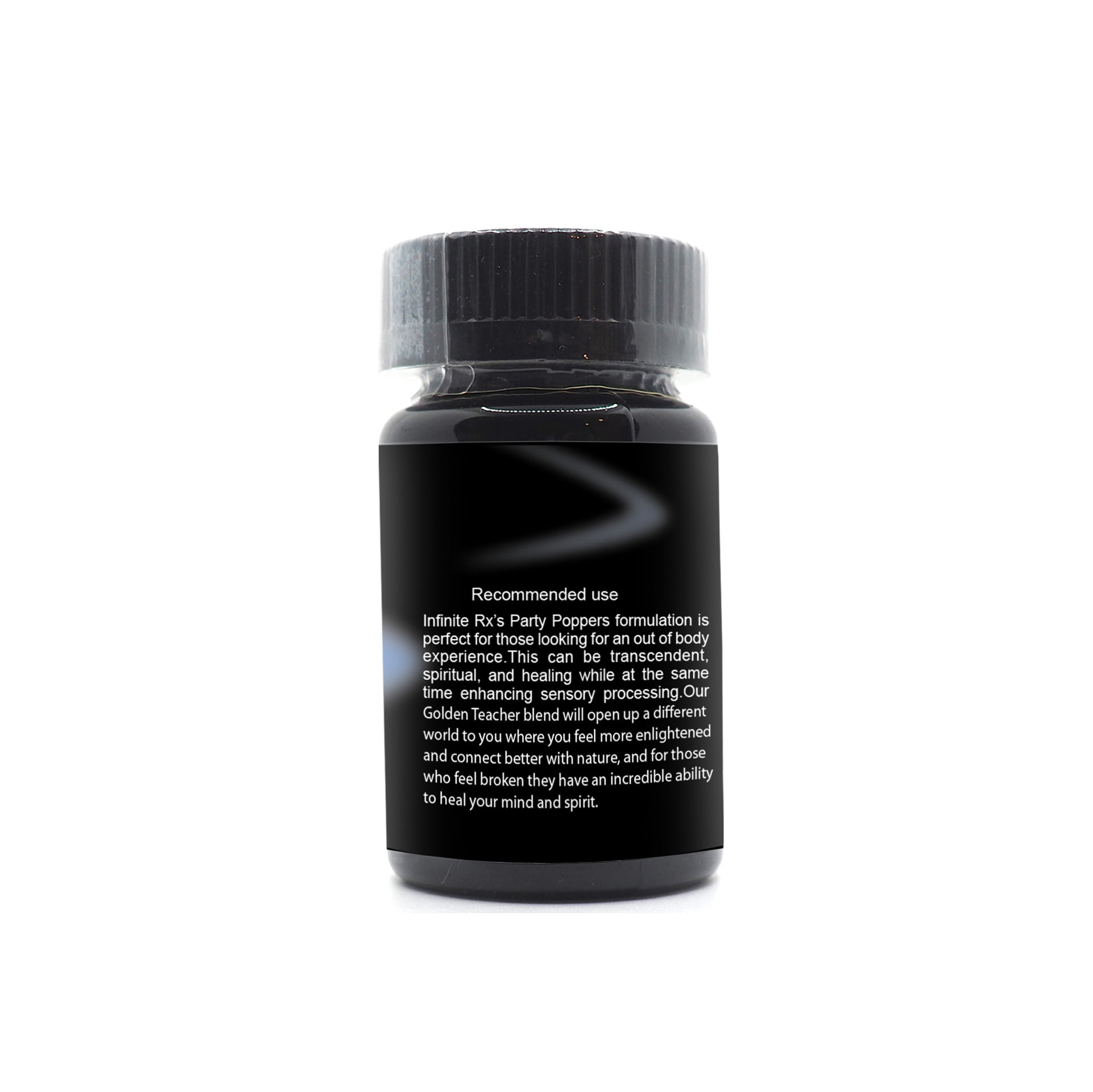 INfinite Rx Party Poppers Golden Teachers (G.T) Macrodosing Mushroom capsules will provide a mildly high psychedelic effect therefore making it a gateway shroom for first timers. The Golden Teacher strain is one of the most popular and common strains of magic mushrooms. They are best known for their shamanistic properties or spiritual effects, euphoric properties, and reliable trip. These mushrooms provide less visuals but an immense perceptual experience. Each bottle contains 15 capsules. Each capsule contains 500mg of our Golden Teacher blend.