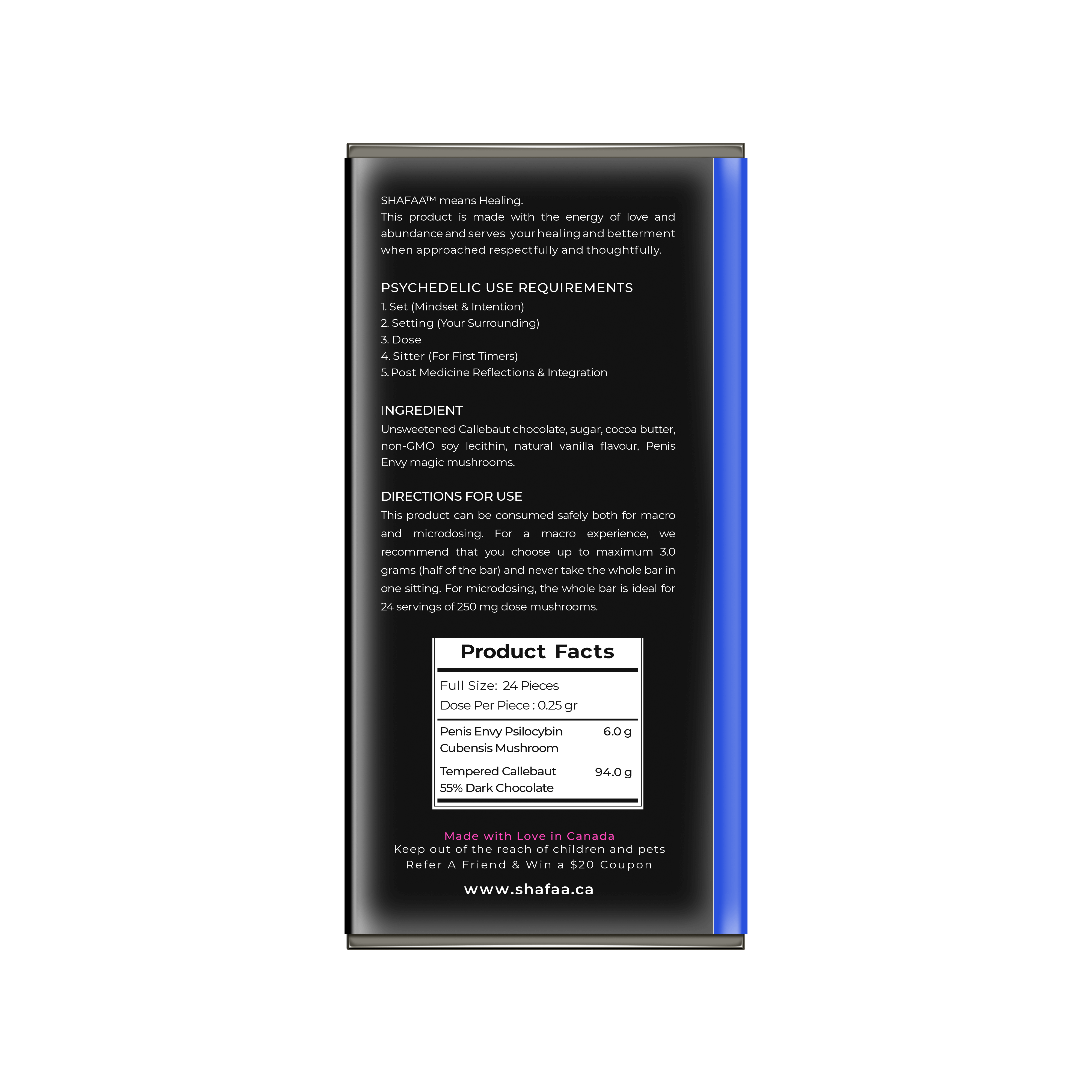 The bar consists of 24 breakable pieces with 0.25 grams of Penis Envy magic mushrooms per piece, making it easy for both macrodosing and microdosing regimens.